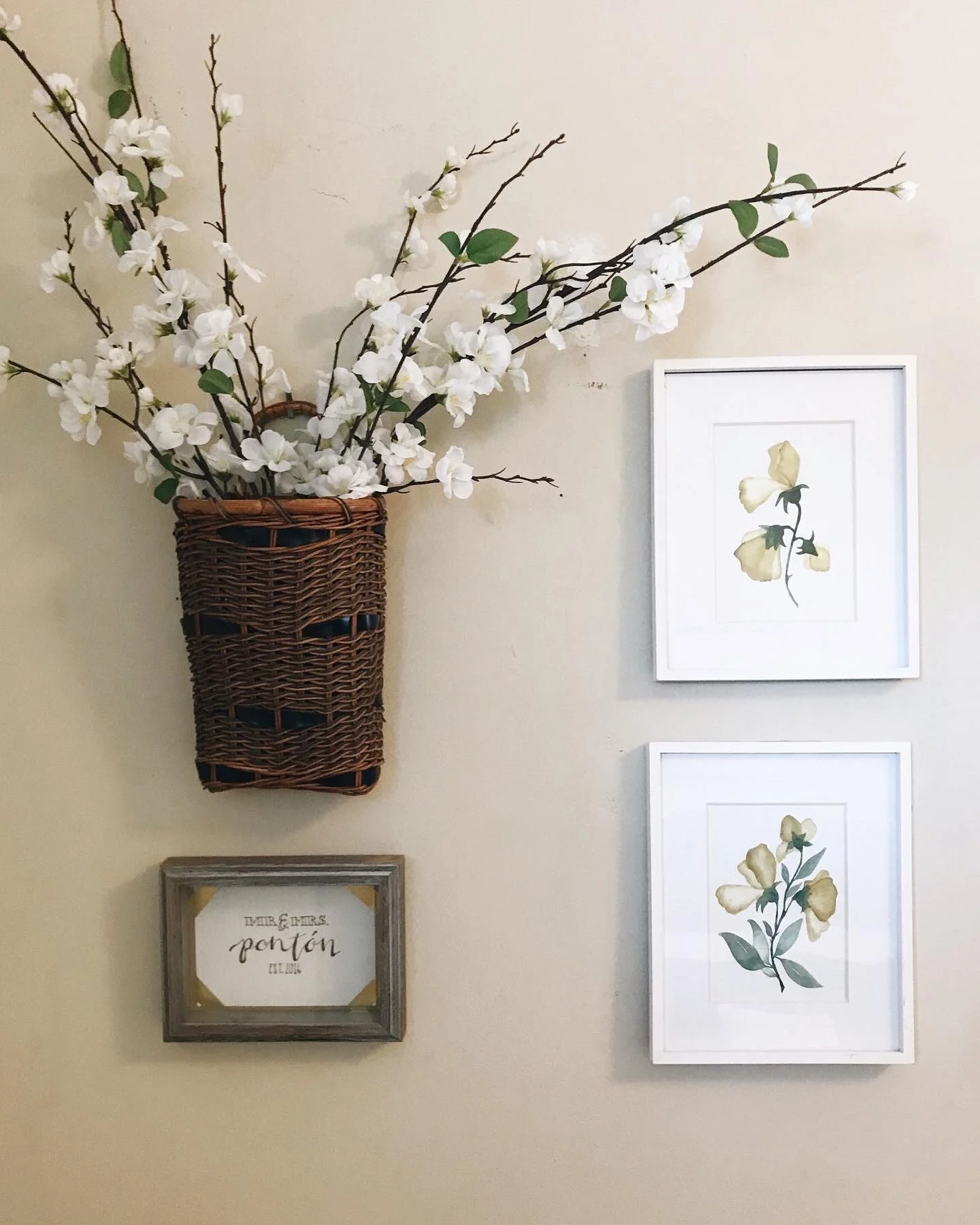 On our second wall, we had this fun basket that brings more of a 3D element to the gallery, filled with dried out eucalyptus stems (I recently just replaced with faux cherry blossom stems). Below the basket is a cute sign my friend made us when G and I got engaged, and beside those two elements are two watercolor prints from a friend’s etsy store.